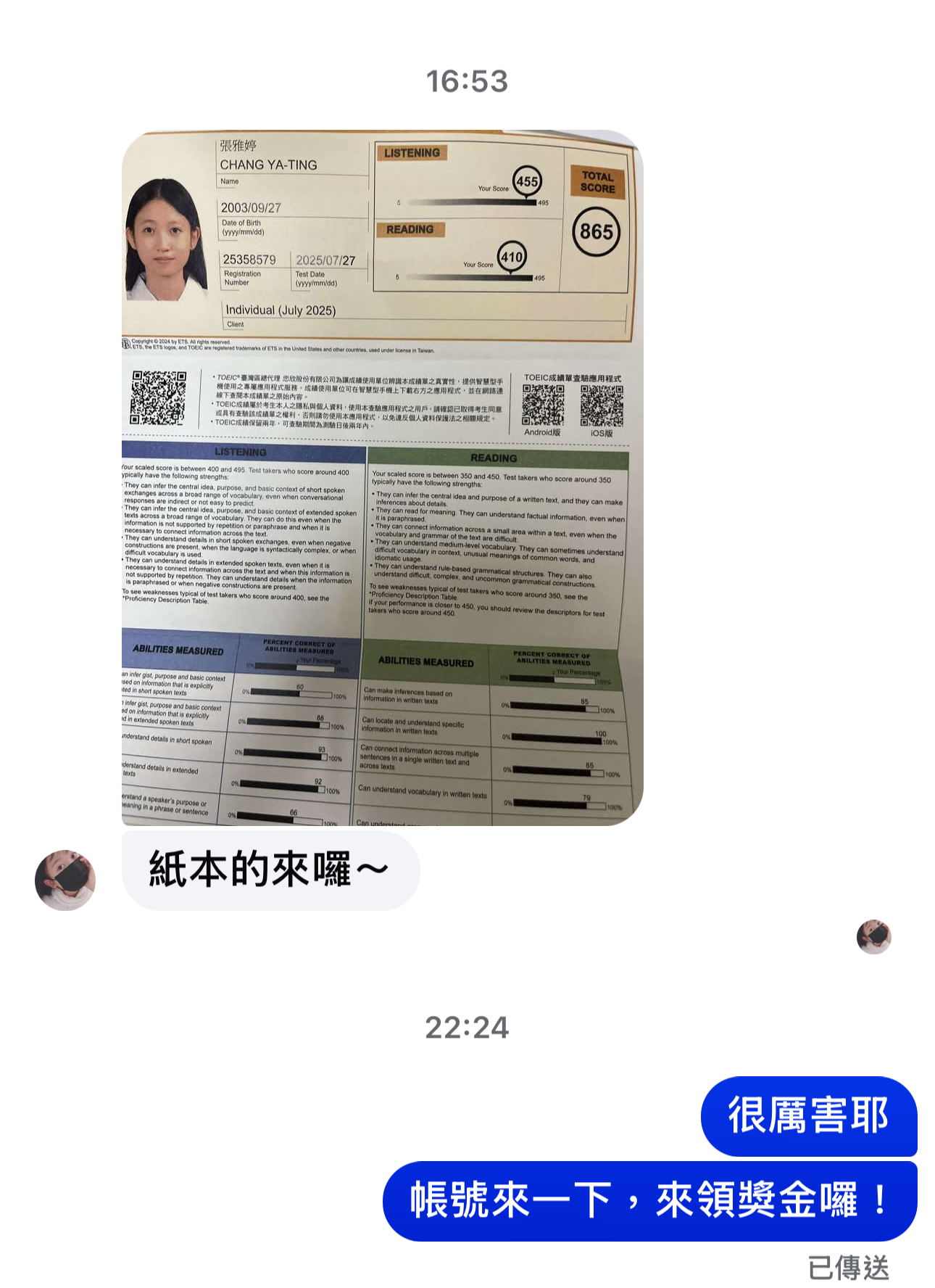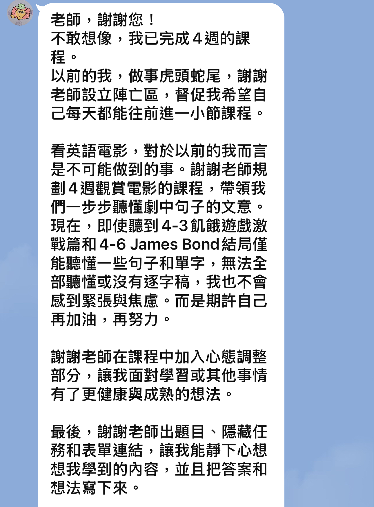 但最我感動的是,他用到我上課裡面的句型!